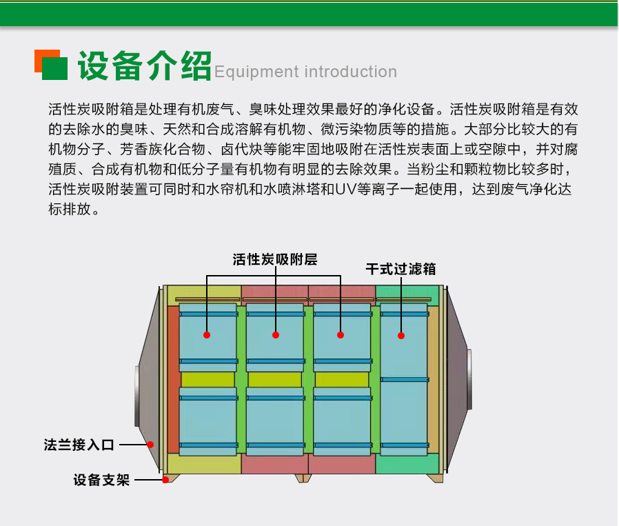 活性炭吸附裝置整體可采用PP、不銹鋼、鐵等材料制成,采用抽屜式的加炭方式,操作方便,占地面積小,安裝好即可使用,無需人工看管,做好清洗與換炭工作即可。