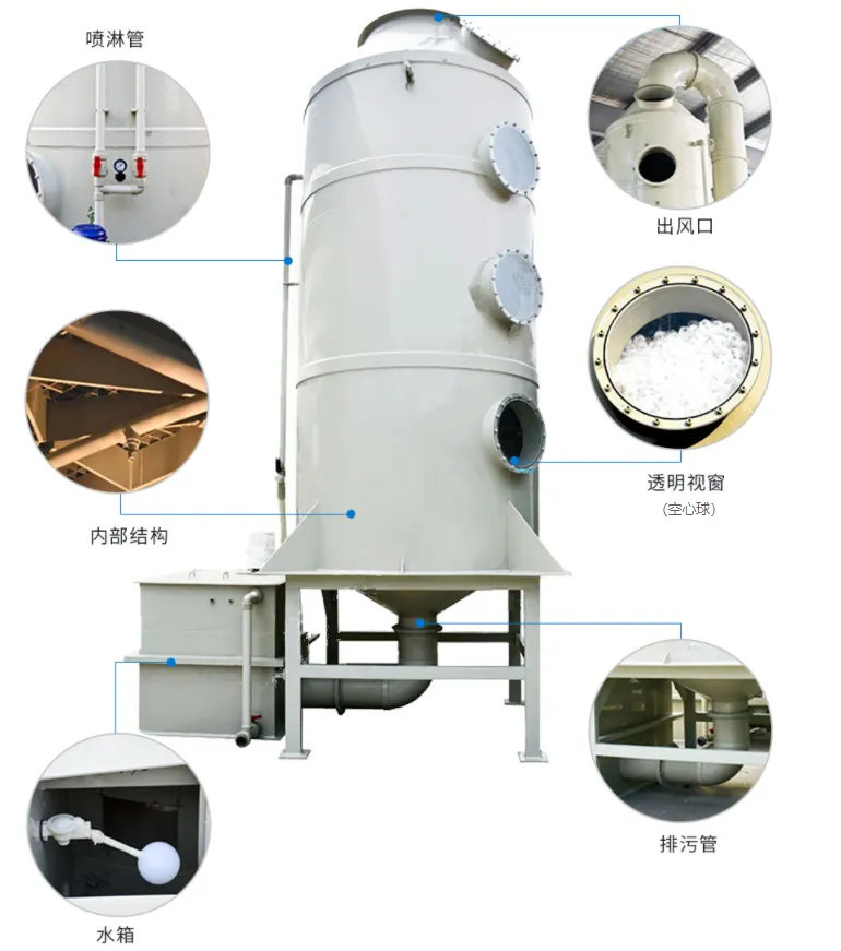 噴淋塔對各種腐蝕性氣體凈化處理效果明顯,能有效去除氯化氫氣體(HCl)、氟化氫氣體(HF)、氨氣(NH3)、硫酸霧(H2SO4)、鉻酸霧(CrO3)、氰氫酸氣體(HCN)、堿蒸氣(NaOH)、福爾馬林(HCHO)等水溶性氣體。噴淋塔廢氣凈化效率高、操作管理簡單、使用壽命長,凈化處理后的酸堿廢氣排放達到國家排放標準。