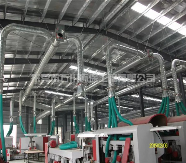 該系統的風管為不銹鋼材質,法蘭連接,部分風管架空在生產機器上方。
